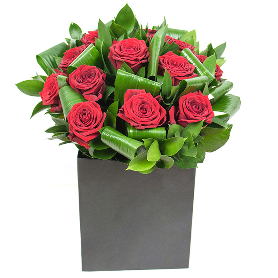 Infuse grace into your home with our red rose bouquet, featuring rich red roses, elegant aspidistra leaves, and fresh ruscus. This unique combination offers a beautiful and stylish floral display.